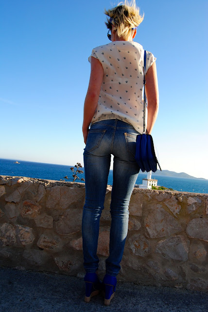 Outfit, with diamonds, in the print of the shirt, combined with turban shoes and bag in blue klein, point the color of the season. Jeans high rise that I have seen many times, because they are very comfortable and look good with any thing you want to combine. The earrings mimic the shape of a diamond, and combined with the print of the shirt, which is the star of today's outfit.